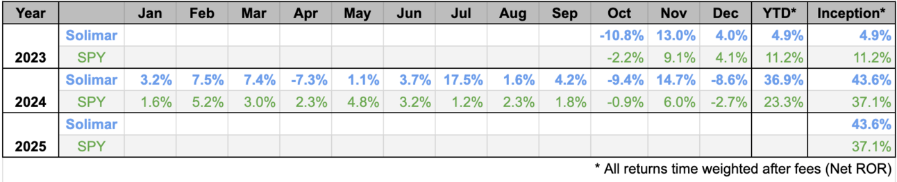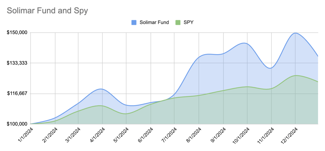 2024 was an exciting year for Solimar Fund as we embarked on the path to achieve bold and ambitious goals: doubling the S&P 500’s (SPY) returns annually with half the SPY’s 5-year risk while avoiding negative returns in any year.