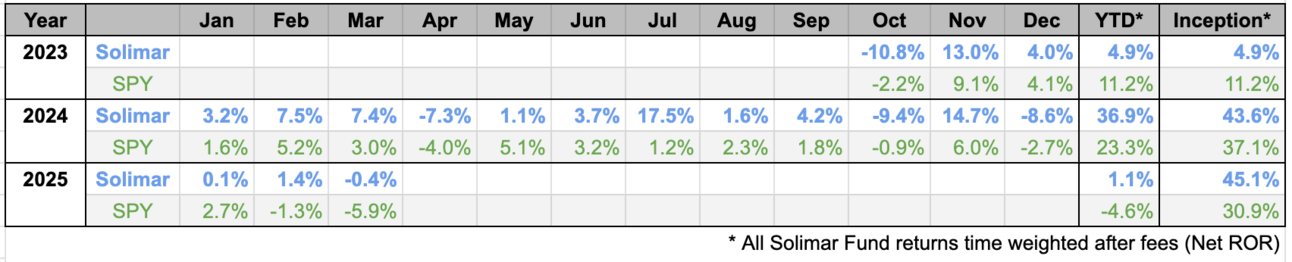 Solimar Fund Net Lifetime Performance (10/1/23- 3/31/25): 45.1%