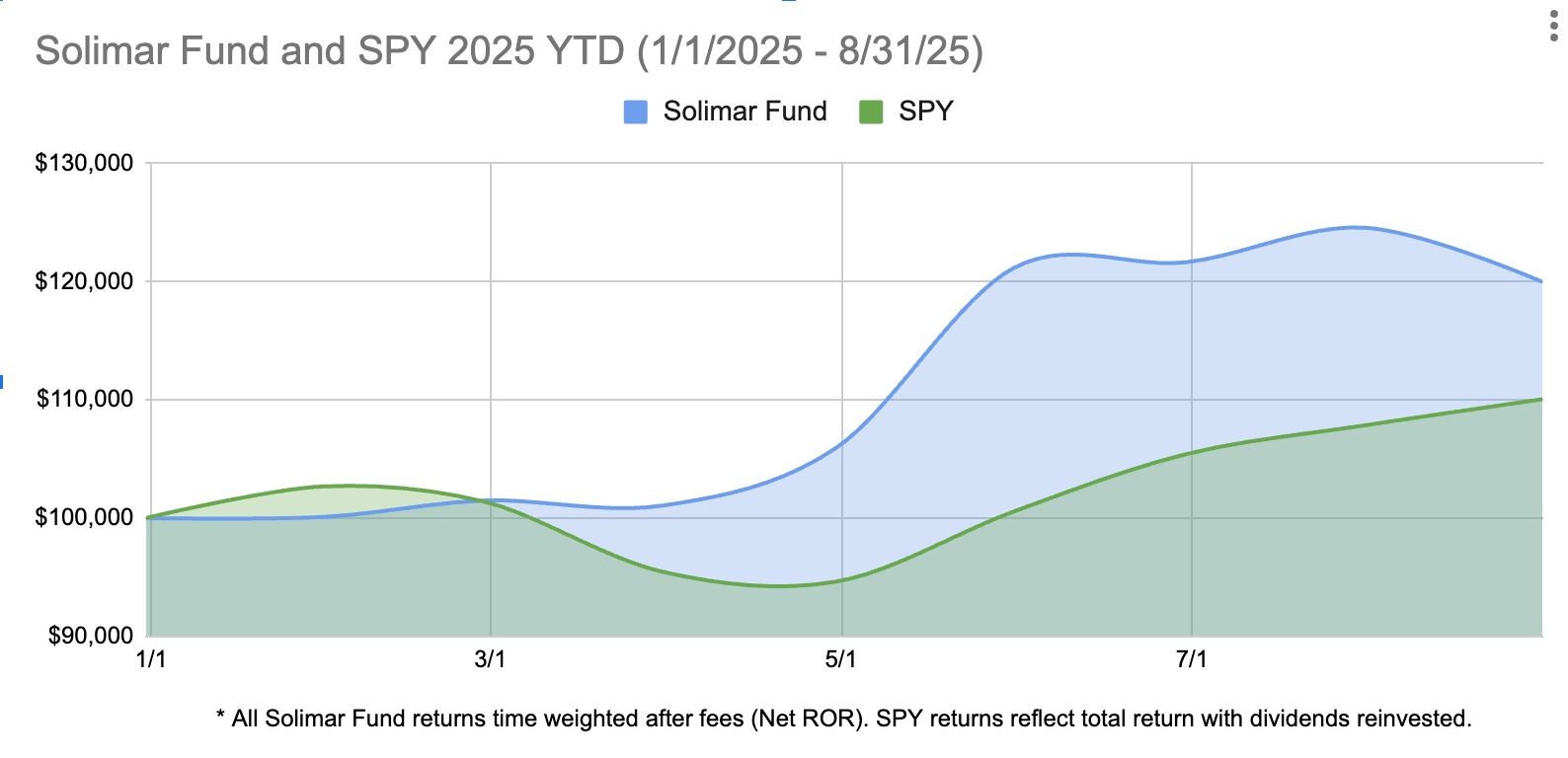 Solimar Fund YTD Performance after fees (1/1/25- 8/31/25): 20.0%