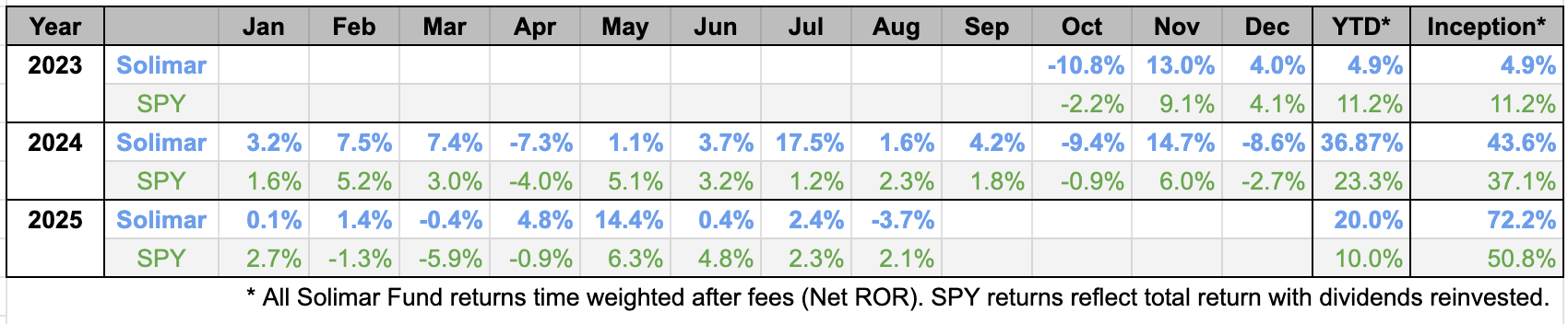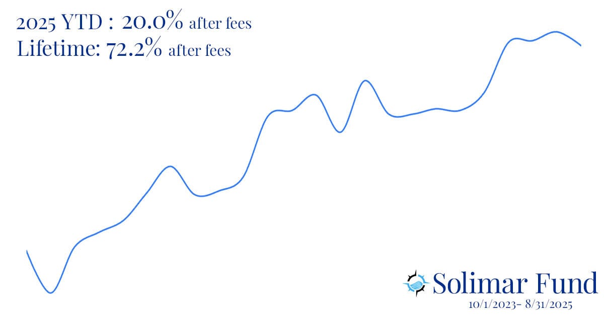 Solimar Fund returned -3.7% after fees in August bringing our net year-to-date return to 20.0%—compared to the SPY’s 10.0% YTD*. Since inception on October 1, 2023, Solimar Fund has generated a net return of +72.2% after fees in just under two years (10/1/23-8/31/25), as reported by our third-party fund administrator.