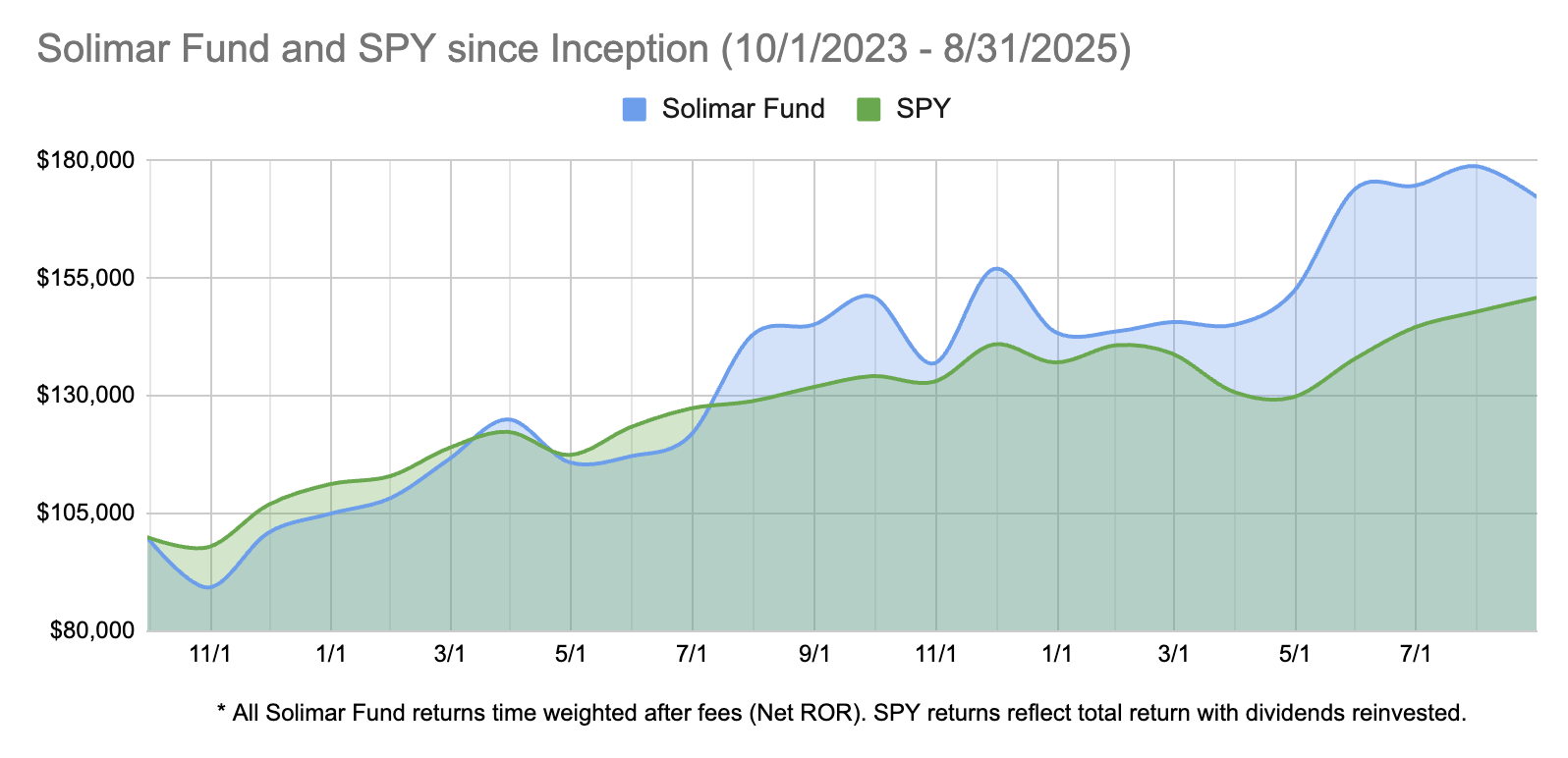 Solimar Fund Net Lifetime Performance (10/1/23- 8/31/25): 72.2%