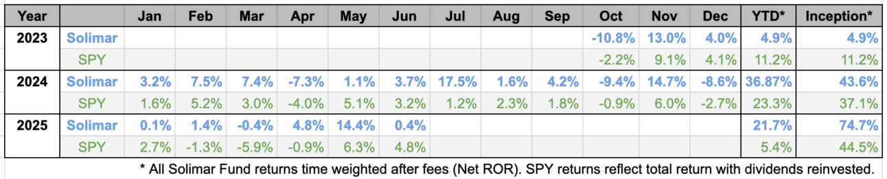 Solimar Fund returned 0.4% after fees in June, bringing us to 21.7% after fees YTD, while the S&P 500 is at 5.4% YTD. Since Inception Solimar Fund is up 74.7% after fees in less than two years (10/1/23-6/30/25).