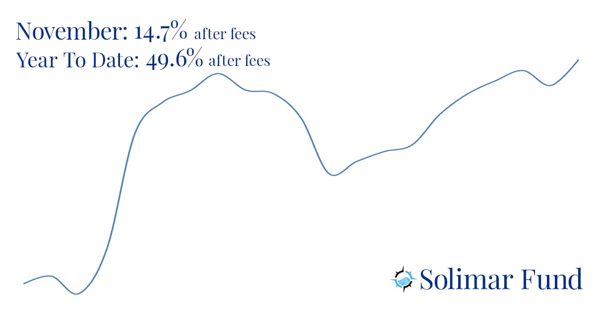 In November, Solimar Fund delivered a remarkable 14.7% after fees for our investors, far outpacing the S&P 500’s (SPY) impressive 6.0% month. Year-to-date, the Fund stands among the top hedge funds in the industry with a return of 49.6% after fees, compared to the SPY’s solid 26.8% gain.